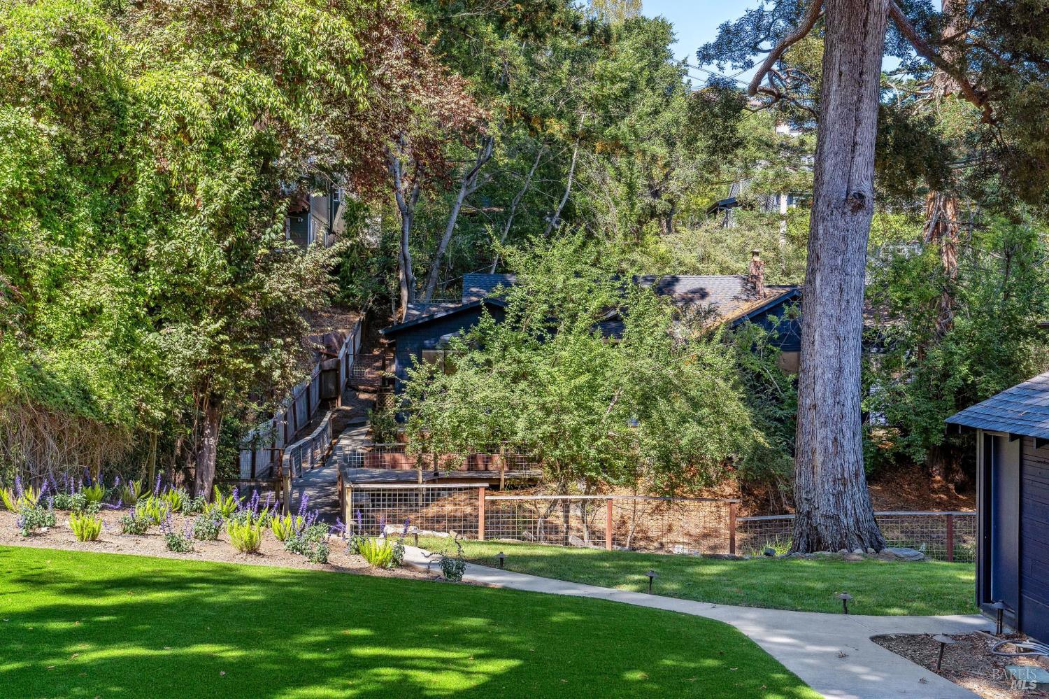 This turnkey completely remodeled home situated at the rear of a double private lot features a chef's kitchen, soaring ceilings and a wood burning fireplace. Superbly located in a warm weather area in the desirable flats of Homestead Valley. The substantial south facing level lot features an enormous yard, majestic redwoods, and a babbling fresh water creek. Walking distance to the award winning Marin Horizon School and Homestead Valley swimming pool. Be sure to ask about development opportunities!